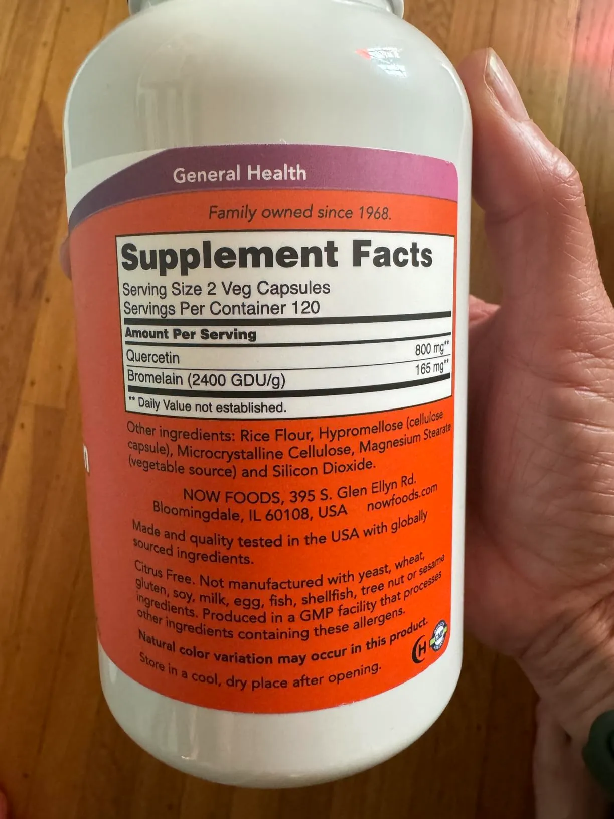 Each capsule contains 800 mg Quercetin and 165 mg Bromelain (per 2-capsule serving). NOW formulates this product with vegan, non-GMO, and GMP-certified standards.